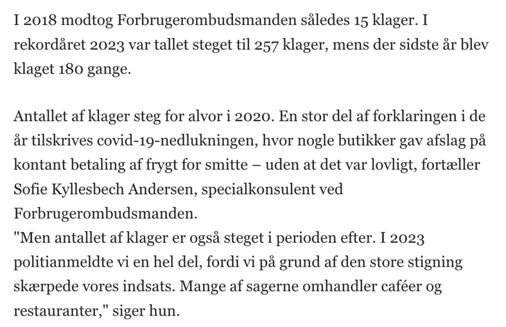 (Der er paywall på artikel – link her: https://www.kristeligt-dagblad.dk/danmark/flere-klager-over-butikker-der-ikke-tager-imod-kontanter-det-er-og-boer-vaere-en-rettighed )